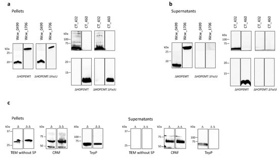 Three proteins were used as controls in this assay (Figure 1c): (i) a truncated form of the E. coli β lactamase lacking its signal peptide (TEM without SP) that should not be secreted, (ii) CPAF, a protein secreted by a Sec-dependent pathway [46] and (iii) the C. trachomatis translocated early phosphoprotein, TepP (CT875), a known T3SS effector [52,53]. These three control proteins were detected in the bacterial pellets of both Y. enterocolitica strains, demonstrating efficient expression. TEM without SP was not present in the culture supernatant of either strain, whereas CPAF was detected in both HOPEMT and HOPEMT YscU supernatants. TepP was detected only in the case of a functional T3SS. To exclude bacterial lysis or fraction contamination, the supernatant fractions were probed against the strictly cytosolic Y. enterocolitica MreB protein (Supplementary Figures S1–S3) [33].