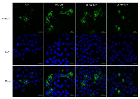HEK 293 T cells were seeded on glass coverslips at 1 × 105 cells per well in 24-well microplates. The following day, cells were transfected with pDEST47_CT460/CT432/EfTu or pDEST53 (GFP alone) using Lipofectamine 3000 Reagent (Thermo Fisher Scientific, Waltham, MA, USA) following the manufacturer’s instructions. Twenty-four hours later, cells were fixed with 2% paraformaldehyde during 15 min. Immunofluorescence was performed as described below with a mouse monoclonal anti-GFP antibody (Thermo Fisher Scientific, Waltham, MA, USA) at a 1/500 dilution and DAPI dilactate (4’,6-Diamidino-2-Phenylindole Dihydrochloride, Molecular Probes, Thermo Fisher Scientific, Waltham, MA, USA) at 1/30000 dilution. Cells were observed under a confocal microscope (Zeiss LSM 710 or 780 Quasar Confocal Microscope, Feldbach, Switzerland) at the Cellular Imaging Facility of Lausanne University.