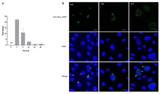 Wcw_0499 is an early to mid-cycle effector detected in the host cell cytosol at late stages of infection (a) Wcw_0499 transcriptional expression was analysed by RT-qPCR during the course of an infection in Vero cells and normalised at 48h pi according to 16SrRNA gene expression. Results are the mean and SD of three independent experiments. At 3 h post infection, expression could only be detected in one experiment. nd: not detected. (b) Vero cells infected with W. chondrophila were stained with a polyclonal mouse antibody against Wcw_0499 (green) and DAPI (blue) at 16, 24 and 32 h post infection. White arrows point at area where secretion can be observed. Scale bar: 20μm.