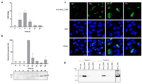 Protein expression was analysed in infected cells by immunoblot using a specific anti-Wcw_1706 antibody. Relative abundance of the protein was quantified by normalising the signal measured on the blot according to the number of bacteria loaded in each lane as assessed by quantitative PCR [9]. The highest protein expression (defined as 100%) was observed at 16 h pi but the low sensitivity of this technique did not allow detection before this time point (Figure 4b). Protein expression could also be visualised by immunofluorescence staining of infected Vero cells. This technique allowed detection of a signal corresponding to Wcw_1706 already at 8 h pi (Figure 4c). At this and later time points, the specific signal corresponding to Wcw_1706 nicely co-localised with the DAPI staining of bacterial DNA in inclusions.