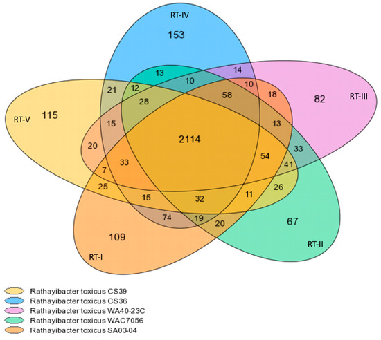 Core/Variable/Pan-genome analyses. The representative strains of R. toxicus populations were analyzed with the MicroScope Microbial Genome Annotation and Analysis Platform. The pan-, core-, and variable-genome for the five R. toxicus populations comprises 3262, 2114, and 1148 gene families (Figure 1), which correspond to 13,117, 10,812 and 2365 genes, respectively. The MicroScope summary output is shown in Table 2. Gene family counts (Table 2) differed slightly from those reported in the Venn diagram generated from the same program (Figure 1); the reason is unclear. Based on Figure 1, RT-I and RT-IV are most closely related, sharing the most total gene families (241) outside the core and having the most gene families shared between only these two populations (74). RT-I is next closest to RT-II and then RT-III, sharing 207 and 193 total gene families outside the core, and 20 and 18 gene families only between the two populations, respectively. RT-II and RT-III appear most closely related, sharing 237 total gene families outside the core and 33 gene families only between these two populations. RT-V is closest to RT-II, RT-III, and then RT-I, sharing 204, 198 and 177 total gene families outside the core, and 26, 20 and 25 gene families only between the two populations, respectively. RT-IV and RT-V were the least related, sharing only 156 total gene families outside the core and 21 gene families only between these two populations. RT-IV is closer to RT-II and then RT-III, sharing 172 and 168 total gene families outside the core, and 13 and 14 gene families only between the two populations, respectively. It is important to note that these numbers reflect gene families, as designated by MicroScope; the actual number of genes common between populations will differ, but the trends should remain the same. Based on shared gene family content, the relationship among strains is as follows: RT-IV ↔ RT-I ↔ RT-II ↔ RT-III ↔ RT-V. Unfortunately, evolutionary relationships cannot be determined based on gene content information only.