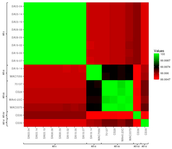 ANI calculator: ANI values were compared between all strain genomes tested using the ANI calculator (Table S15). ANI values produced by the ANI calculator were over 99.99% for all strain comparisons, which were higher than those produce by other analyses; higher ANI values from the ANI calculator were observed previously [150]. Nonetheless, ANI values were converted into a visual heat map for comparison (Figure 2). All strains grouped together with those of the same population type, reinforcing the population designations. Based on ANI values, RT-II and RT-III appear most closely related, as does RT-I and RT-IV. RT-V appears most closely related to RT-III and then RT-II; RT-V was most distantly related to RT-IV. This data is highly similar to that from pan-genome analyses. The ANI calculator data output includes a phylogenetic tree, which was imported into Geneious for tree generation (Figure 3). The phylogenetic tree produced from ANI distances shows the same trend; RT-II and RT-III are most closely related, with RT-V being the next closely related, while RT-I and RT-IV are most closely related. The web-interface for the ANI calculator also produces phylogenetic trees based on the NJ (Figure S5A) [112], BIONJ (Figure S5B) [151], and Unweighted Pair Group Method with Arithmetic Mean (UPGMA) (Figure S5C) [152] methods. The UPGMA tree is in complete agreement with Figure 3 and the ANI and pan-genome data with regards to population relatedness. The NJ and BIONJ trees have identical topologies that differ from the UPGMA tree; however, the relationships inferred from these trees are the same as the UPGMA tree, although lineages cannot be elucidated.