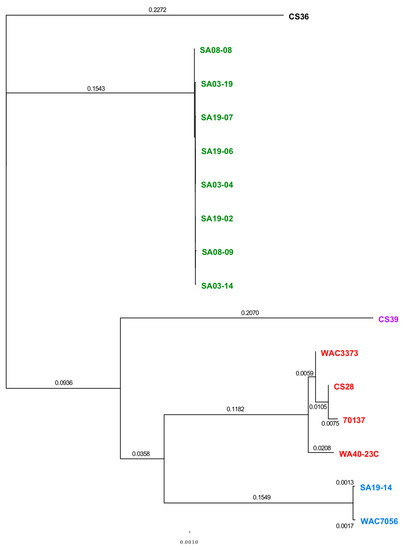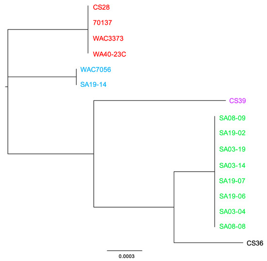 MAUVE and REALPHY analysis showed strains CS28 and WAC3773 group close together with negligible distance within the clade; while 70137 groups with these two strains, it is separated from these two strains within the same clade by some phylogenetic distance. This was also observed from phylogenetic analyses using the ANI calculator (Figure S5C). These observed differences agree with the notion that the genome sequence of strain 70137 is inaccurate. Strain WA40-23C groups together with the other RT-III strains, but groups out separately in all phylogenetic analyses, including those from the ANI calculator. This is most likely due to the fact that this strain was isolated many years after the others, providing ample time to accumulate mutations that make its genome sequence different enough to be observed by these analyses. Similar findings were observed when analyzing the CRISPR spacer.