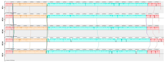 Phylogenetic analyses were used to determine the relationship among the R. toxicus strains used in this study. Complete genome sequences were aligned using MAUVE (Figure S9A). Strain 70137 (RT-III) appeared to have an inversion not present in any other strain; Sechler et al. [19] also showed this phenomenon. Simple sequence repeat (SSR) analysis of R. toxicus strain 70137 showed a drastic difference in repeat length when comparing a microsatellite identified within the sequence deposited in GenBank to its PCR verification results. Strain 70137 was isolated around the same time as CS28 and WAC3373, which have similar alignments. Being the only strain to possess this inversion, along with the SSR discrepancy, suggests that this anomaly is attributed to inaccurate sequence assembly. Therefore, a new alignment was performed in MAUVE that did not include strain 70137 (Figure S9B). No major inversions or rearrangements were observed for any R. toxicus strain tested, with the exception of strain 70137, which is consistent with results from Sechler et al. [19]. Strains of RT-I, RT-II and RT-III showed a high degree of similarity to others included in their respective populations; therefore, a MAUVE alignment was created using the strains representative of populations RT-I, RT-II, RT-III, RT-IV and RT-V (Figure 4).