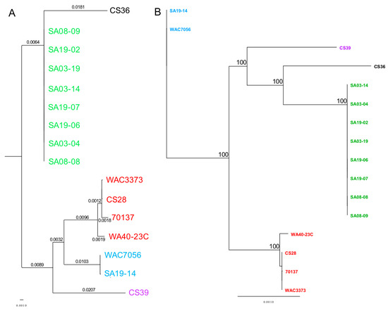 Whole-genome sequences (WGS) for Rathayibacter toxicus strains 70137 and WAC3373 were obtained from the National Center for Biotechnology Information (NCBI) [37] GenBank nucleotide database [38,39,40]. WGS for R. toxicus strains SA03-04 [41], SA19-14, WA40-23C, WAC7056 (type strain), CS28, CS36, CS38 and CS39 were obtained using PacBio RS II single molecule real-time (SMRT) sequencing (Pacific Biosciences, Menlo Park, CA, USA). WGS for R. toxicus strains SA03-14, SA03-19, SA08-07, SA08-08, SA08-09, SA19-02, SA19-06, SA19-07 were obtained using Illumina MiSeq (Illumina Inc., San Diego, CA, USA); PacBio sequencing data were de novo assembled with HGAP [42] using default parameters (500 bp min. subread length; 6 kb min. seed read length) and polished with Quiver. Illumina MiSeq data were assembled by mapping to complete PacBio genomes using Bowtie2 [43] in Geneious version 7.1.9 [44], and/or de novo using the Geneious assembler [44]. A single-contig complete genome was not obtained for CS38 and genome assembly for SA08-07 was not adequate; therefore, these two strains were excluded from whole-genome analyses. Sequence data for CS38 and SA08-07 were adequate for gene extraction and therefore included in specific-gene and multi-locus sequence analysis (MLSA). All single-contig complete genomes were reoriented with the replication initiation factor (dnaA) gene as the starting point, using MEGA7 [45,46]. PacBio sequence data for representative strains of each population group (strains SA03-04, WAC7056, WA40-23C, CS36 and CS39 for groups RT-I, RT-II, RT-III, RT-IV and RT-V, respectively) were annotated through the United States Department of Energy (US DOE) Joint Genome Institute (JGI) (https://img.jgi.doe.gov/cgi-bin/submit/main.cgi) Integrated Microbial Genome Expert Review (IGM/ER) using the Isolate Genome Gene Calling method (File S1; Figure S1). Information about the strains used in this study is presented in Table 1. Genome sequences were deposited into NCBI GenBank, with annotations created using the NCBI Prokaryotic Genome Annotation Pipeline (PGAP) [47,48] (File S2).