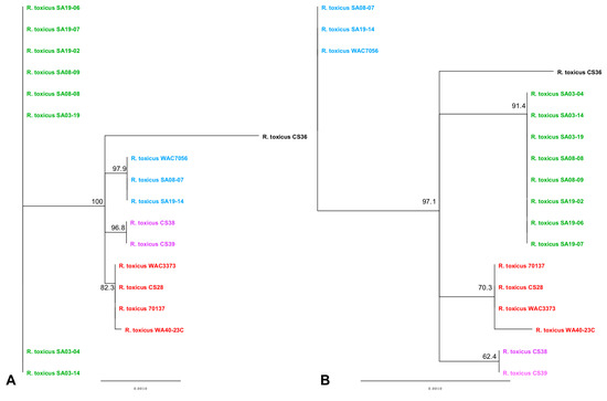 Whole-genome phylogenetic analysis of R. toxicus strains tested in this study. (A) Genome sequences were aligned with MAUVE and the tree data were input into Geneious for tree generation. (B) Genome sequences were analyzed using REALPHY. The REALPHY alignment data were input into Geneious for tree generation. Neighbor-joining (NJ) trees were calculated using the Jukes-Cantor method to compute evolutionary distances. Confidence intervals were assessed using the bootstrap method with 1000 replications. Strains within the phylogenetic tree are color-coded based on the genetic population. Green: RT-I; blue: RT-II; red: RT-III; black: RT-IV; purple: RT-V.
