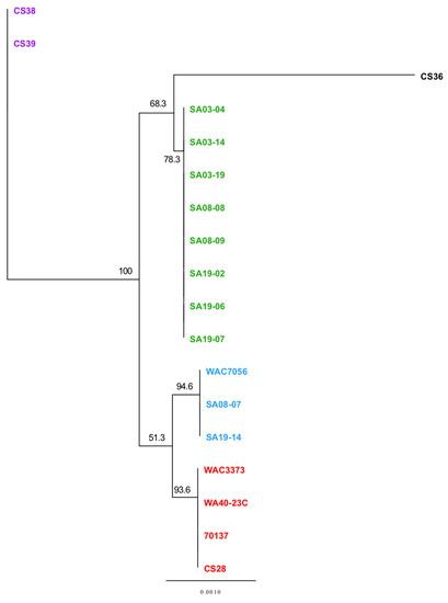 Within the genus of Rathayibacter, R. toxicus is genetically unique from other species; it is the only species of Rathayibacter to possess clustered regularly interspaced short palindromic repeats (CRISPR) and CRISPR-associated proteins (Cas) as part of the CRISPR-Cas system [19,28,29,30], it is the only Rathayibacter species reported to contain a functional tunicamycin gene cluster [16,17,18,19,20], and it possesses the smallest genome with the lowest G+C content. Among R. toxicus isolates, sub-specific groups (populations) have been identified using several techniques, including amplified fragment-length polymorphisms (AFLP) analysis and pulse-field gel electrophoresis (PFGE), with Western Australian isolates (Group A; RT-III) being genetically distinct from those found in South Australia (Group B; RT-II), and one strain (FH100; Group C) grouping separately [31,32,33,34]. Recently, Arif et al. [35] used multi-locus sequence typing (MLST) and inter-simple sequence repeat (ISSR; inter-microsatellite) analysis and confirmed previous findings, as well as identified a newly emergent population in South Australia, designated RT-I, that was genetically distinct from both RT-II and RT-III. Davis II et al. [28,30] used whole-genome single nucleotide polymorphism (SNP) analysis and confirmed earlier groupings; however, this study did not include isolates from population RT-I. A recent study replicated the MLST analysis by Arif et al. [35] using additional isolates and described two additional genetic populations, RT-IV (based on two isolates from New South Wales, Australia) and RT-V (based on two isolates from southeast South Australia) [36]. The objective of the present study was to use a multifaceted approach, based on genome-wide analyses, to more completely characterize the R. toxicus genome and further investigate variation among R. toxicus populations. This study represents the first in-depth genome-wide investigation of R. toxicus to includes all five populations. Genomic data is presented in its entirety and results described in this study confirm the existence of five genetically distinct populations.