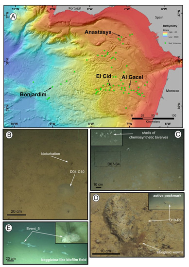 Chemosynthetic fauna is widely distributed and often found in deep-sea areas of active fluid seepage where oxygen levels are normally low, such as in hydrothermal vents and cold seeps. Yet, they can also be found in other reduced environments, such as whale and wood falls [1,2,3,4,5]. While the composition of the seepage fluids is variable, some (micro)organisms have adapted to use some of the most abundant constituents as their energy and/or carbon source, i.e., methane and sulfur compounds. These chemosynthetic organisms sustain these ecosystems by acting as primary producers and supplying the higher trophic levels with nutrients [6,7]. They also provide the hard substrate that most filter-feeders need to settle and develop. As an example, authigenic carbonates formed due to the anaerobic oxidation of methane (AOM) [8] act as optimal substrate for sponges and corals.