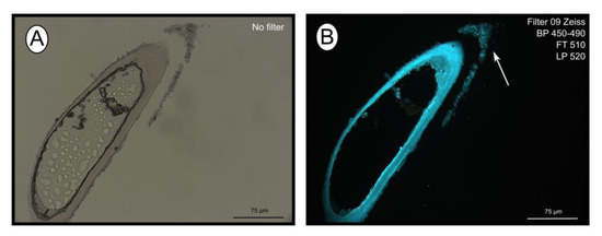 Calcofluor white staining of empty tubes recovered from Al Gacel MV. The fluorescence of the tube indicates the presence of chitin. Same section under normal light (A) and using Filter 09 with an excitation range between 450 and 490 nm (B). Notice the fluorescence of the tube and of the detached microbial layer (marked with an arrow).