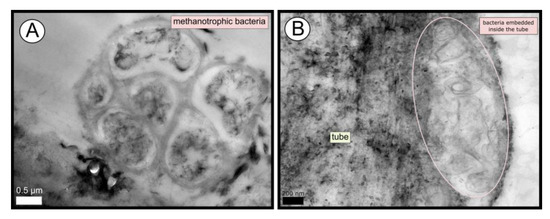 TEM micrographs of remains of a microbial biofilm from tubes of Anastasya MV worms. (A) Remains of methanotrophic bacteria are commonly observed. (B) Many microorganisms appear to be embedded inside the tube.