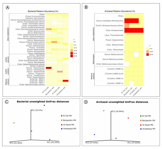 The archaeal community profile was dominated by Woeserarchaeota (or DHVEG-6, Nanoarchaeota), followed by methane-oxidizing archaea (ANME-1 and ANME-2) as the second most abundant taxa, except in Anastasya MV where methanogens are slightly more abundant (Figure 7B,D). Additionally, methanogenic archaea were homogeneous among the samples, except in the Al Gacel MV where they were almost absent (Figure 7B).
