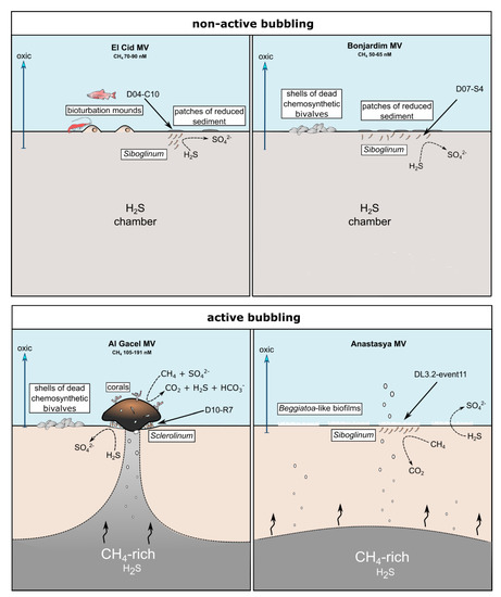 El Cid MV and Bonjardim MV specimens were recovered from sites where non-active emission of fluids was detected, and methane concentration was relatively low (70–90 nM and 50–65 nM, respectively; Sánchez-Guillamón et al., 2015) (Figure 8) [58]. The site of El Cid MV from where worms were sampled, was surrounded by non-chemosynthetic fauna (shrimps, fish; Figure 8), while Bonjardim MV sampling was performed in an area where patches of reduced sediment (biofilm-like) and dead bivalves were observed (Figure 8). The sampled sediment with siboglinids from Bonjardim MV emanated a strong smell of hydrogen sulfide, potentially indicating the occurrence of anaerobic oxidation of methane (AOM) in the past. Likewise, the high relative abundance of sulfide oxidizers in El Cid MV samples may also indicate past AOM events (Figure 7C). In fact, DNA related to ANME in both inactive sites was detected (El Cid MV and Bonjardim MV; Figure 7B). Furthermore, sulfate-reducing bacteria are much less abundant in these samples when compared to known active sites (i.e., Al Gacel MV and Anastasya MV; Figure 7A).