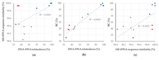Analysis of 16S rDNA sequences is conventionally used as a primary method to identify strains at the genus level. Recently, the similarity of 99.0% was proposed as a boundary to discriminate species in actinobacteria classification [22]. However, a 16S rDNA sequence similarity of >99.0% does not necessarily guarantee that both strains belong to the same species. For example, we have recently classified two strains with completely identical 16S rDNA sequences into two different species [7]. In contrast, there are also cases in which strains showing a difference of 1 nt in their 16S rDNA sequence are classified into the same species [15]. These examples support the notion that 16S rDNA sequences do not have enough resolution to provide definitive identification [22]. For species-level identification, DNA–DNA relatedness provides a clear-cut criterion for bacterial classification [13,16]. We have investigated DNA–DNA relatedness based on whole genome sequences between Streptomyces strains with >99% similarities in 16S rDNA sequences [7,15,23,24]. The relationship between 16S rDNA sequence similarity and DNA–DNA relatedness is shown in Figure 3a. Proportional relation may be observed but the correlation coefficient is not high (R2 = 0.3935), and many strains (grey and red dots) are identified as different species even though their 16S rDNA sequence similarities are >99.0% [7,15,22].