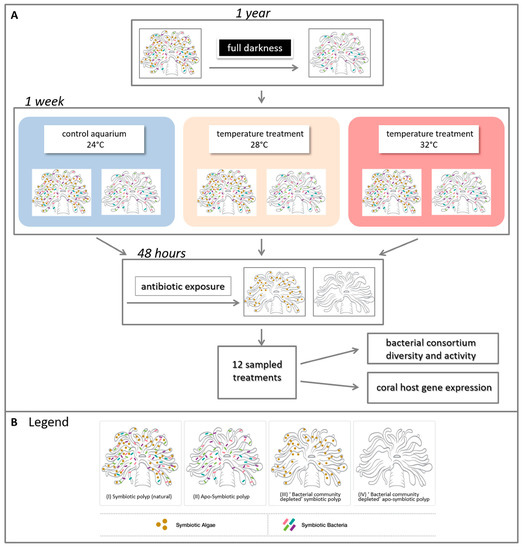 Experimental design. (A) Experiment layout and (B) legend of four generated symbiotic states. Four adult colonies of Euphyllia paradivisa were collected from 40–60 m depth from the Gulf of Eilat and fragmented. Half of the fragments were kept in darkness for a year to generate a full apo-symbiotic type. Symbiotic and apo-symbiotic fragments were subjected to heat-stress for a week, at 28 and 32 °C, and, as a control, 24 °C. After this time, half of the fragments (from each temperature and symbiotic state) were exposed to antibiotics for 48 h to create a “bacterial community depleted” type. In total, 12 treatments (2 symbiotic morphs × 3 temperatures × 2 bacterial states = 12) were analysed for associated microbial communities and host gene expression (see Tables S1 and S2 for additional details).