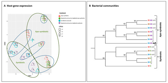 Similarly, the bacterial communities clustered according to the coral state first (symbiotic or apo-symbiotic) but in contrast to gene expression, we see here subdivision according to antibiotic exposure rather than temperature (dashed line in Figure 2B). Another observation to note is that in the symbiotic corals, the 24 and 28 °C bacterial communities clustered together and separately from the 32 °C treatment. But, in the apo-symbiotic corals, the 28 °C and 32 °C treatments clustered together and separately from the 24 °C treatment. Also worth noting is that the separation between the antibiotics treated and un-treated groups was more distinctive in the apo-symbiotic polyps (Figure 2B).