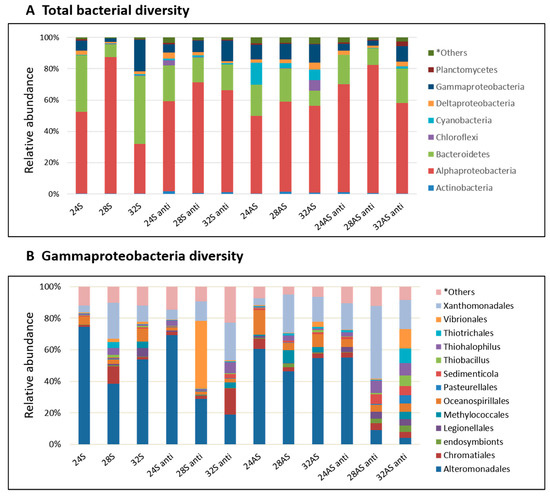 While gammaproteobacteria made only 20% of the microbial community in the 24 °C symbiotic colonies, it is an important member of the holobiont, as some of the pathogens known for coral bleaching and other diseases are associated with that family [51,52] Therefore, a more careful inspection was done on the specific class of gammaproteobacteria in the different conditions (Figure 3B). The most striking observation was the difference between the community compositions of the control and colonies that were exposed to the most extreme treatment–the apo-symbiotic colonies treated with antibiotics at 28 and 32 °C. While the control colonies were dominated by Alteromonadales, the 28 and 32 °C treated colonies were more diverse and included 7–9 families with equal percentages and one dominant family in the 28 °C colonies and three co-dominants in the 32 °C colonies. One family that increased its abundance in those and other colonies was the Xanthomonadales. Other families that showed an increase in some of the colonies included Chromatiales, Oceanospirillales, and Vibrionales, all of which on the expense of Alteromonadales.