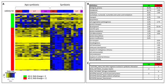 Heat map of hierarchical clustering and enrichment analysis of all apo-symbiotic vs all symbiotic samples. (A) A heat map showing the relative transcript abundance levels of differentially expressed genes (p value < 0.05) having a mean fold change of > 2 or < −2, between apo-symbiotic samples and symbiotic samples. The tested groups, colonies 14, 15, 17 and 18, are marked in the horizontal colour bar: red, blue, pink and purple, respectively. (B) Enriched Gene Ontologies (GOs) in the up-regulated and down-regulated groups of apo-symbiotic vs symbiotic analysis. GO slim terms, generated by the web-based tool CateGOrizer [50], are presented as a percentage of the total GOs of the group. (C) Other GO, KEGG pathways, INTERPRO domains of interest that were significantly enriched in the up- or down-regulated groups are marked with V. An asterisk marks a result from a reciprocal BLAST analysis.