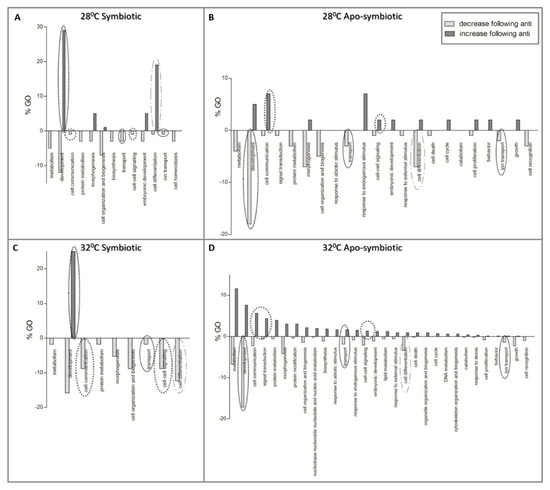 The effect of antibiotic exposure on coral host gene expression. Enriched Gene Ontologies (GOs) of differentially expressed genes which their fold change was either lower (light grey) or higher (dark grey) following the antibiotic exposure. GO slim terms, generated by the web-based tool CateGOrizer [50], are presented as a percentage of the total GOs. (A) symbiotic E. paradivisa at 28 °C, (B) apo-symbiotic E. paradivisa at 28 °C, (C) symbiotic E. paradivisa at 32 °C, and (D) apo-symbiotic E. paradivisa at 32 °C. Several GOs of interest are marked with circles: development, communication, differentiation, and transport in the cell.