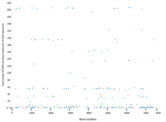 Number of sequences carrying each of the 199 SNP loci identified. Blue dots indicated bi-allelic SNP locations, red dots indicate tri-allelic SNP locations, and green dots are intergenic SNPs.