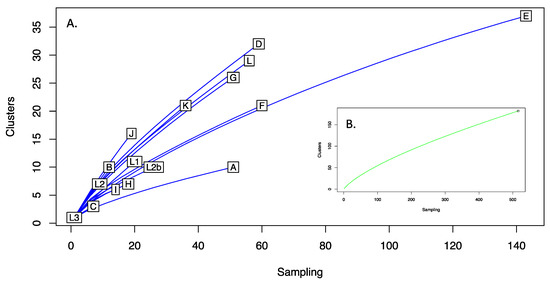 Rarefaction of C. trachomatis plasmid nucleotide sequences. Aligned sequences were clustered using cd-hit-est at 100% nucleotide identity. The diversity of each lineage, as measured by cluster discovery versus sampling effort (rarefaction), is shown for each plasmid lineage (A) and all plasmid sequences (inset (B)). No asymptotes were observed indicating sampling effort had not captured all the diversity within the C. trachomatis plasmid populations. Lineages A and C were the least diverse (L3 being represented by only one sequence), with D and J the most diverse.