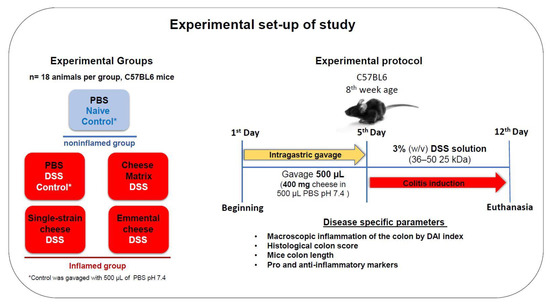 Similar properties were reported for lactic acid bacteria, which may be used for Emmental cheese manufacturing [22]. Regarding all these data, we hypothesized that selection of specific lactic acid bacteria and dairy propionibacteria strains presenting anti-inflammatory properties could lead to a potentially probiotic Emmental favouring the treatment of IBD [19,20,23,24]. Therefore, the aim of this study was to evaluate the beneficial impact of an Emmental, made using three selected anti-inflammatory strains P. freudenreichii CIRM-BIA 129 [20], Lactobacillus delbrueckii subsp. lactis CNRZ327 [23], and Streptococcus thermophilus LMD-9 [25], in the context of Dextran Sodium Sulphate (DSS)-induced colitis in mice.