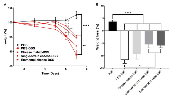 Impact of cheese matrix, single-strain cheese and Emmental cheese on colitis-induced body weight loss. (A) Time-course of mice body weight monitoring, and differences across groups. (B) Body weight loss observed at the 7th day of DSS colitis induction, and differences across groups. Groups were as follows. PBS: healthy group gavaged using PBS buffer as a sham. PBS-DSS: DSS-treated-colitis control group gavaged using PBS buffer as a sham. Cheese matrix-DSS: DSS-treated group gavaged using a germ-free dairy matrix. Single-strain cheese-DSS: DSS-treated group gavaged using an experimental single-strain cheese containing P. freudenreichii CIRM-BIA 129 as a sole bacterium. Emmental-DSS: DSS-treated group gavaged using an industrial Emmental cheese produced using P. freudenreichii CIRM-BIA 129 as a ripening starter. The data represent the mean ± SD of 18 mice per group. Multiple comparisons were performed, * p < 0.05, ** p < 0.01, *** p < 0.001 **** p < 0.0001.