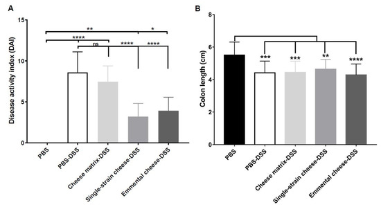 Impact of cheese matrix, single-strain cheese and Emmental cheese on the severity of DSS-induced colitis. Seven days after colitis induction, disease activity index (DAI) (A) and Colon length (B) were determined. Groups were as follows. PBS: healthy group gavaged using PBS buffer as a sham. PBS-DSS: DSS-treated-colitis control group gavaged using PBS buffer as a sham. Cheese matrix-DSS: DSS-treated group gavaged using a germ-free dairy matrix. Single-strain cheese-DSS: DSS-treated group gavaged using an experimental single-strain cheese containing P. freudenreichii CIRM-BIA 129 as a sole bacterium. Emmental-DSS: DSS-treated group gavaged using an industrial Emmental cheese produced using P. freudenreichii CIRM-BIA 129 as a ripening starter. The data represent the mean ± SD of 18 mice per group. Multiple comparisons were performed, * p < 0.05, ** p < 0.01, *** p < 0.001 **** p < 0.0001.