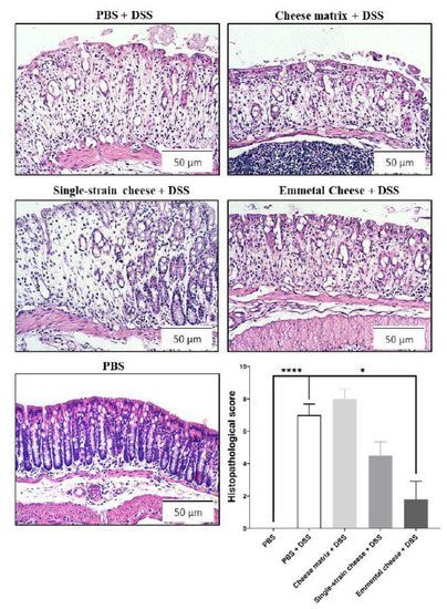 Impact of cheese matrix, single-strain cheese and Emmental cheese on DSS-induced histopathological damages. Representative images of mice colon mucosa sections, stained with haematoxylin, are shown. Image acquisition phase was done with a 20× magnification objective. Scale bar = 50 μm. Histopathological scores were determined. Groups were as follows. PBS: healthy group gavaged using PBS buffer as a sham. PBS-DSS: DSS-treated-colitis control group gavaged using PBS buffer as a sham. Cheese matrix-DSS: DSS-treated group gavaged using a germ-free dairy matrix. Single-strain cheese-DSS: DSS-treated group gavaged using an experimental single-strain cheese containing P. freudenreichii CIRM-BIA 129 as a sole bacterium. Emmental-DSS: DSS-treated group gavaged using an industrial Emmental cheese produced using P. freudenreichii CIRM-BIA 129 as a ripening starter. The data represent the mean ± SD of 6 mice per group. Multiple comparisons were performed, * p < 0.05, ** p < 0.01, *** p < 0.001 **** p < 0.0001.