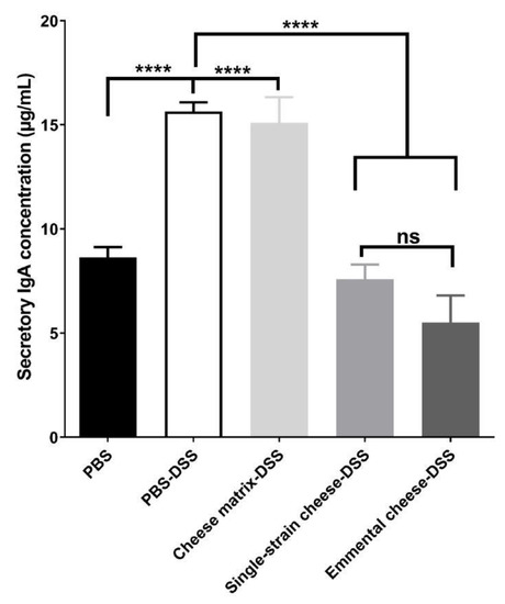 Concentration of secretory IgA in the small intestine of all mice groups was quantified using ELISA. The DSS-induced colitis increased significantly the IgA secretion, from 8.63 ± 1.11 to 15.63 ± 1.02 µg/mL (Figure 5 and Supplemental Table S4). Consumption of control cheese matrix did not attenuate IgA secretion, whereas consumption of single-strain cheese or of Emmental cheese reduced it significantly (7.59 ± 1.71 and 5.51 ± 3.15), compared to the PBS-DSS mice group (Figure 5). There was no significant difference, in terms of IgA secretion, between the single-strain cheese and the Emmental cheese (Figure 5).
