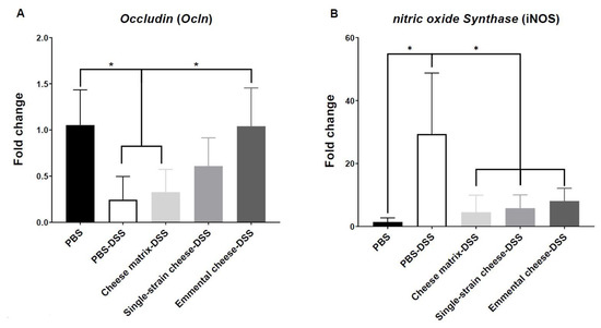 DSS-induced colitis increased IgA secretion in the small bowel, while both single-strain and Emmental cheeses attenuated this increase. Increased IgA secretion is the expression of ileal barrier disturbance by the inflammatory response. Reduced inflammation, as a result of cheese consumption, thus led to attenuated IgA response, suggesting that DSS-induced colitis would affect not only the large intestine but also the small intestine [45,46]. Accordingly, P. freudenreichii CIRM-BIA 129 was shown to reduced IgA response in the context of 5-fluorouracyl-induced mucositis [47]. Indeed, disruption of the gut barrier integrity is a key step of inflammatory bowel diseases [48]. DSS-induced colitis induced a significant increase of nitric oxide synthase (iNOS) expression in the colon tissues and this increase was attenuated by the three tested dairy products. However, only Emmental cheese restored colonic expression of the Ocln gene encoding the transmembrane protein occludin, which contributes to intestinal barrier function [49].