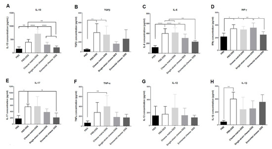 The concentration of pro-inflammatory and anti-inflammatory cytokines in the colonic tissues was assessed in all mice groups by ELISA quantification (Figure 8.). DSS-induced colitis increased IL-10 secretion, compared to the healthy group (Figure 8A). The cheese matrix intake further enhanced secretion of IL-10 during DSS-induced colitis, compared to the healthy group (Figure 8A). However, fermented cheeses consumption reduced IL-10 induction (Figure 8A). DSS-induced colitis increased TGFβ secretion in the PBS-DSS and the cheese matrix-DSS groups (Figure 8B). The Emmental cheese and the single-strain cheese ingestion did not influence significantly TGFβ secretion, compared to the DSS-PBS and the healthy groups (Figure 8B). Concerning IL-6, its concentration was increased during colitis, while this increase was prevented by Emmental cheese consumption (Figure 8C). Similarly, only Emmental cheese attenuated IFNγ secretion induced by the DSS-induced colitis (Figure 8D). DSS-induced colitis increased IL-17 secretion, compared to the healthy group, which is exacerbated by the cheese matrix intake (Figure 8E). Only Emmental cheese was able (p < 0.05) to decrease IL-17 secretion, compared to the PBS-DSS group (Figure 8E). DSS-induced colitis induced a significant increase of TNFα only in the cheese matrix group (Figure 8F). DSS-induced colitis did not induce significant change in IL-12 secretion, compared to the healthy group (Figure 8G). Cheese intake did not either alter significantly IL-12 secretion, compared to healthy group (Figure 8G). Finally, DSS-induced colitis increased IL-1β secretion compared to the healthy group, and this was not attenuated by the Emmental cheese intake (Figure 8H).