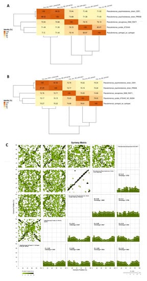 - Brown, S.D.; Utturkar, S.M.; Klingeman, D.M.; Johnson, C.M.; Martin, S.L.; Land, M.L.; Lu, T.Y.; Schadt, C.W.; Doktycz, M.J.; Pelletier, D.A. Twenty-one genome sequences from Pseudomonas species and 19 genome sequences from diverse bacteria isolated from the rhizosphere and endosphere of Populus deltoides. J. Bacteriol. 2012, 194, 5991–5993. [Google Scholar] [CrossRef] [PubMed]