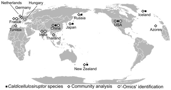 The goal of enriching extremely thermophilic cellulolytic microorganisms was to ultimately identify thermostable enzymes from those organisms. Prior to the isolation of individual species, communities of cellulolytic microbes from geothermally heated springs were enriched on cellulose [7,9,38,39] for initial biochemical and phylogenetic analysis. At that time, New Zealand was the site of the most extensive phylogenetic characterization of Caldicellulosiruptor strains [32]. However, due to the amplicon length constraints of Sanger sequencing, initial CAZymes identified from the genus Caldicellulosiruptor were identified from isolated species, such as C. bescii [19] and C. saccharolyticus [20,40,41,42], rather than from cellulolytic communities. Development of primer pairs specific for conserved regions of 16S rRNA genes (reviewed in [43]) allowed for culture-independent insights into the global presence of the genus Caldicellulosiruptor (see Figure 1). Furthermore, the ability of the genus Caldicellulosiruptor to hydrolyze plant biomass or other recalcitrant polysaccharides and produce acetate and hydrogen at elevated temperatures [44,45,46,47] has led to the identification of environmental strains in fermenters and digesters inoculated with environmental samples.