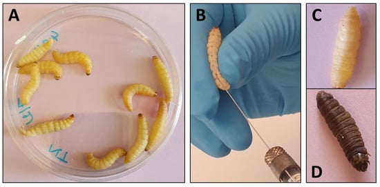 Several interesting mini-host models such as Drosophila melanogaster, Caenorhabditis elegans, and Galleria mellonella have been used for studying the pathophysiology of different fungal species [2,3] and more recently some antifungal treatments have also been evaluated in these models [4,5]. The G. mellonella model is particularly interesting because it is inexpensive, easy to use, and does not require specialized infrastructures. Larvae of the insect G. mellonella are small, allowing smooth handling, and can survive at 37 °C. The results of experiments are easy to be observed by the melanization of the larvae, decreased mobility, and death [6,7]. The immune system in G. mellonella is characterized by several types of hemocytes, several of which have the ability to neutralize and eliminate pathogens [8,9]. In medical mycology, this model has been used mainly for virulence studies but is now also used for antifungal evaluation [2,10,11] (Figure 1).