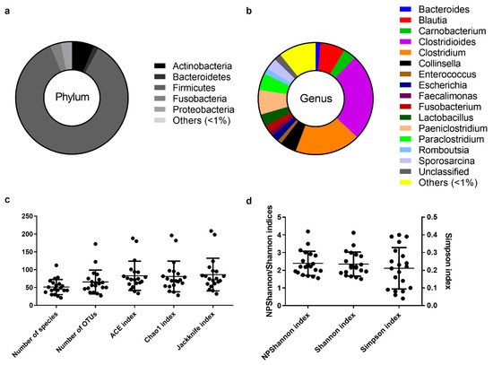 Besides these estimators, rarefaction and rank abundance curves were also plotted. The rarefaction curve is the correlation between the number of reads and the number of OTUs and the steeper the slope, the higher the diversity [27]. Rarefaction curves show a good depth of sequence coverage, with curves beginning to level off after 1500 reads (Supplementary Figure S1). The rank abundance curve is the correlation between the rank of OTUs and the relative abundance of OTUs at each rank—the steeper the slope, the lower the diversity [28]. Rank abundance curves obtained from the OTU list evidence low species evenness across all fecal samples, indicated by the relatively steep curve, highlighting a greater abundance of high-ranking species comparing to low-ranking ones (Supplementary Figure S2).
