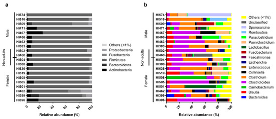 In our previous culture-dependent study [13], the microbial load of intestinal samples seeded in a rich medium under anaerobiosis was higher in females than in males, as indicated by aerobic/anaerobic vegetative and sporobiota communities. Also, Paeniclostridium spp., Pantoea spp., Sporosarcina spp., Solibacillus spp., and Stenotrophomonas spp. isolation was restricted to female individuals, while Paenibacillus spp., Propionibacterium spp., Robinsoniella spp. and Staphylococcus spp. were only isolated from males.