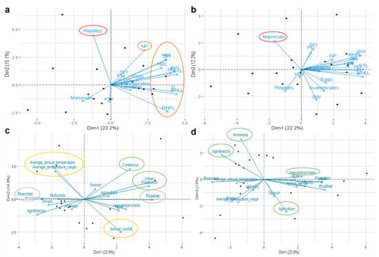 Interaction between bacterial gut microbiota and biotic and abiotic factors of Egyptian mongoose. Principal Component Analysis using: (a,b) biological variables related to stomach content at the time of death and different body measurements; (c,d) environmental variables related to land-use, and climatic, topographic, and population data. The more influential factors are delimited using different colors—red: stomach content; brown: biometric data; green: land-use; yellow: climatic data; grey: topographic data. BW: body weight; STL: snout-tail length; TL: tail length; HBL: head and body length; RHLL: right hind leg length; RHFL: right hind foot length; SH: shoulder height; NP: neck perimeter; HD: head diameter; HW: head width; SW: spleen weight; KW: kidney weight; SFI: solid fat index; PFI: perivisceral fat index.