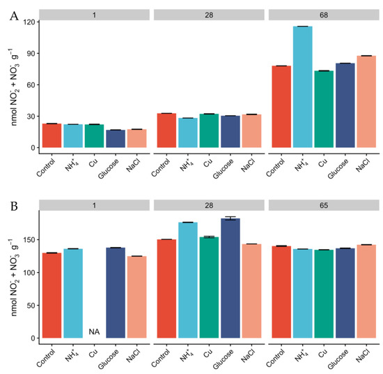 Concentration of NO2− + NO3− (nmol NO2− + NO3− g−1) in Miers (A) and Beacon (B) Valley soils over the course of the experiment, along the different treatments. Columns represent mean values, and bars are the standard deviations of two replicates.