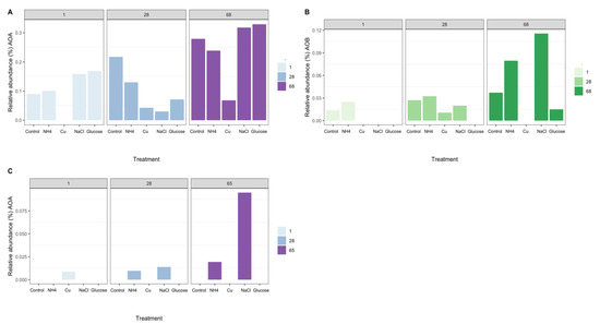 Relative abundance (%) of 16S rRNA transcript cDNA amplicons (Miers Valley—A,B) and 16S rRNA gene PCR amplicons (Beacon Valley—C) assigned to known nitrifying organisms over the course of the experiment and across the different treatments. (A)—Relative abundance (%) of archaeal 16S rRNA transcripts, assigned to ammonia-oxidizing archaea (AOA), in Miers Valley soils over the course of the experiment, between the different treatments. (B)—Relative abundance (%) of 16S rRNA transcripts, assigned to ammonia-oxidizing bacteria (AOB), in Miers Valley soils over the course of the experiment, between the different treatments. (C)—Relative abundance (%) of archaeal 16S rRNA gene, assigned to ammonia-oxidizing archaea (AOA), in Beacon Valley soils over the course of the experiment across the different treatments. The lack of bars represents treatments for which no reads were retrieved.