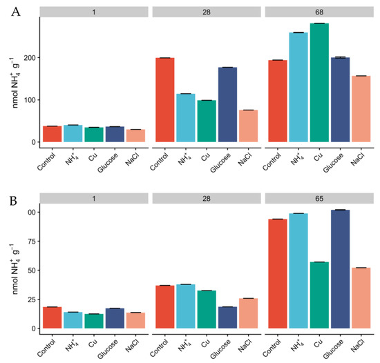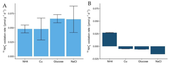 Potential ammonia oxidation rates (pmol g−1 d−1) using labelled 15NH4+ to a final concentration of 4 µM in Miers (A) and Beacon Valleys soils (B) for the following treatments: ammonium augmentation (NH4+), Cu and glucose amendments, and conductivity treatment. Error bars indicate the standard variation in the rates measured of two replicates.