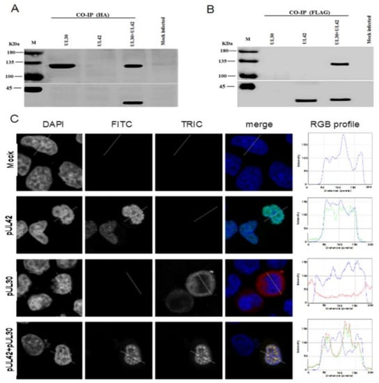 The primers contained the molecular tags HA and FLAGat the N-terminal of UL30 and UL42 proteins, respectively. The amplified genes were cloned into the eukaryotic expression plasmid pcDNA4 (Thermo Fisher, Rockford, IL, USA) and resulting recombinant expression plasmids were named as pcDNA4-UL30-HA and pcDNA4-UL42-FLAG, respectively. All constructs were confirmed by PCR and DNA sequencing of PCR products.