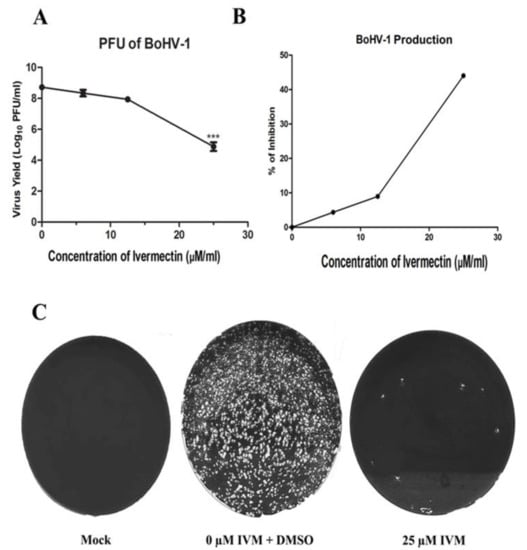 MDBK cells were seeded on cell culture flasks. After 20–24 h, the cells were washed with phosphate buffered saline (PBS) and infected with BoHV-1 at a multiplicity of infection (MOI) of 0.1 or 1 PFU per cell along with increasing concentrations of IVM. At 2 h post infection (PI), the cells were washed three times with PBS to remove unattached viruses. After washing, the maintenance medium was added along with the various concentrations of IVM mentioned above. At different time points, cell-associated viral progeny was collected by three cycles of freeze/thawing, mixed with cell culture supernatant, and viral titers were quantified by plaque reduction assays (PRAs).