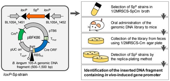 A plasmid library was constructed by inserting a bifidobacterial genomic DNA fragment into the BglII site of pBFK86 (Figure 1). Genomic DNA (480 μg) from B. longum 105-A was partially digested with Sau3AI, and then 500–1500-bp DNA fragments were collected using a MinElute gel extraction kit (Qiagen, Hilden, Germany) after agarose gel electrophoresis. The DNA fragments were ligated into BglII-digested pBFK86, and the ligation products were cloned in E. coli DH5α. Plasmids were extracted from ~80,000 E. coli transformants and introduced into the loxP-Sp strain by electrotransformation. After electroporation, the cells were anaerobically incubated for 1 h in 1/2MRSCS-Sp broth and then spread on 1/2MRSCS-Cm agar plates. After 2 days of incubation, ~120,000 Bifidobacterium transformants were anaerobically suspended in 1/2MRSCS broth supplemented with 10% glycerol and the resulting R-IVET library was dispensed into aliquots and frozen at −80 °C until use. The library suspension was also incubated on 1/2MRSCS-Cm and 1/2MRSCS-SpCm agar plates to determine the proportion of SpR strains in the library. Colony PCR was carried out using a primer pair Pr-Blo0277/Pr-Blo0318 (Table 2 no. 15), and the resulting PCR products were used for Sanger sequencing to determine the size and nucleotide sequence of the DNA fragments inserted upstream of the Cre gene.