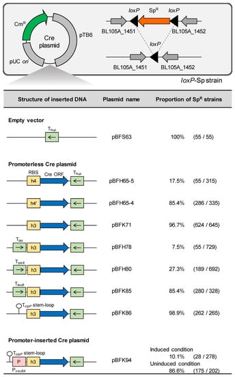 Proportion of SpR strains when each Cre expression plasmid was independently introduced into the loxP-Sp strain. Detailed methods are described in Section 2.5 of the Materials and Methods. The proportion of SpR strains in the tested strains is shown as a percentage. The values in parenthesis indicate the number of SpR strains among the tested strains. SpR, spectinomycin resistance; CmR, chloramphenicol resistance. Green box with an arrow, terminator; yellow box, ribosome-binding site (RBS); pink box, promoter.