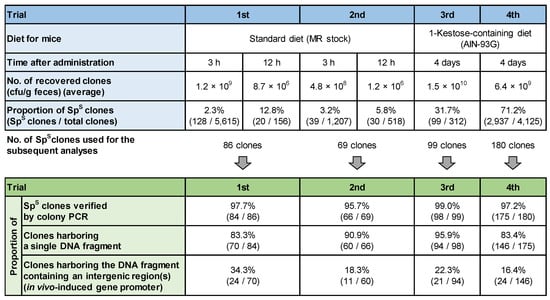 The third and fourth trials of the screening were conducted as described in Section 2.7.1 except for differences in the animal rearing conditions and timing for collection of fecal samples after administration of the R-IVET library. The inoculum (approximately 109 cells) of the R-IVET library was prepared as described above and orally administered to 7-week-old mice (n = 2 for third and fourth trials, respectively) that were fed the AIN-93G control diet. After the administration, the diet was changed to the AIN-93G-based, 1-kestose containing diet, enabling B. longum 105-A to colonize the mouse intestines (see Section 2.2). Fresh feces were collected from two mice in each trial at 4 days after the administration and used for screening in vivo-induced genes as described in Section 2.7.1.