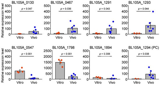 In vitro and in vivo relative expression levels of the genes identified by R-IVET. BL105A_1294 (encoding β-fructofuranosidase (glycoside hydrolase family 32)) was used as a positive control (PC) in qRT-PCR analysis, while the other genes were used to verify in vivo-induced expression in the cecum. BL105A_1946 (rnpA) was used as a reference gene. Data obtained from in vitro (n = 4) and in vivo (n = 6) conditions are expressed as the mean ± standard deviation together with each data plot. After testing the equality of variance by the F-test, Student’s or Welch two-tailed t-tests were used to evaluate statistical significance. p-values of the t-tests are also indicated in each panel and p < 0.05 was considered as statistically significant.