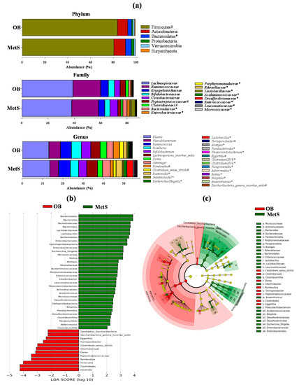 (a) Microbial taxonomic composition in fecal samples from obese (OB) and metabolic syndrome (MetS) participants, showing the mean abundance (%) at phylum, family, and genus levels. # Higher abundance in OB; * higher abundance in MetS. (b) Differently abundant bacterial communities between OB and MetS were identified using linear discriminant analysis (LDA) combined with effect size (LEfSe) algorithm. The taxa shown have a value of LDA score (log10) above 2.0. (c) Cladogram, derived from LEfSe analysis of differential gut microbial taxa, is represented by rings with phyla in the outermost ring and genera in the innermost ring. The nodes indicate the abundance of the microorganism. Red and green nodes represent taxa significantly (p < 0.05) overabundant in OB and MetS, respectively, while yellow nodes indicate taxa that were not differentially abundant (p > 0.05).