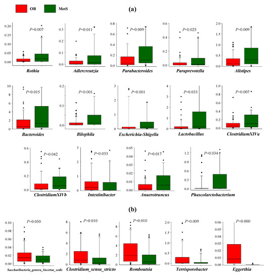 Genera significantly (p < 0.05) overabundant in (a) MetS vs. OB, and (b) overabundant in OB vs. MetS. OB, red bars; MetS, green bars. The comparison was performed using the Mann–Whitney Rank Sum Test.