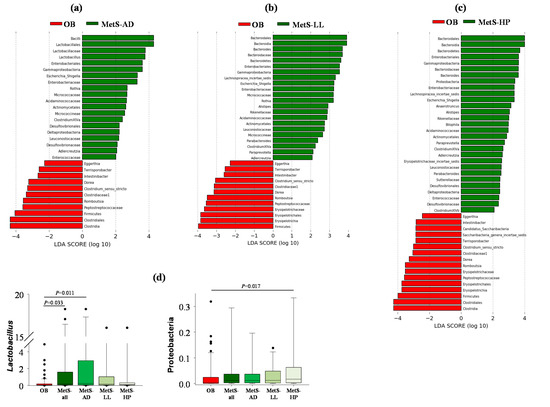 Taking into account the above results, we next explored the potential contribution of the primary CVD risk factors (diabetes, dyslipidemia, and hypertension, and(or) their associated drug treatments) in the different taxonomic signatures observed between OB and MetS patients. As in the case of OB, no sex-specific differences in the gut microbiota were found within MetS patients. Figure 3a–c show statistically significant differences in the taxonomic signature of OB vs. MetS-AD, OB vs. MetS-LL, and OB vs. MetS-HP patients, respectively. However, a further statistical analysis comparing all groups at once to deepen the specific contribution of each medication (or CVD risk factor) on microbial gut composition revealed only two microbial groups, i.e., Lactobacillus genus and Proteobacteria phylum that were significantly enriched in MetS-AD and MetS-HP patients, respectively, vs. OB (Figure 3d).