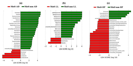 Differently abundant bacterial groups within MetS patients, depending on their therapy, using LEfSe analysis. (a) AD, oral anti-diabetics; (b) LL, lipid-lowering drugs; (c) HP, anti-hypertensive drugs.